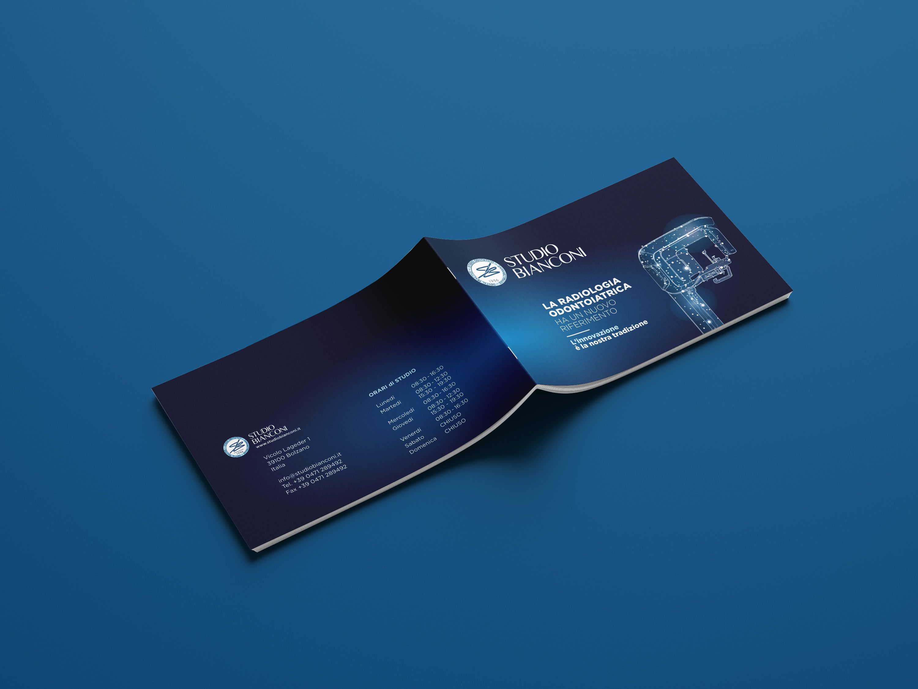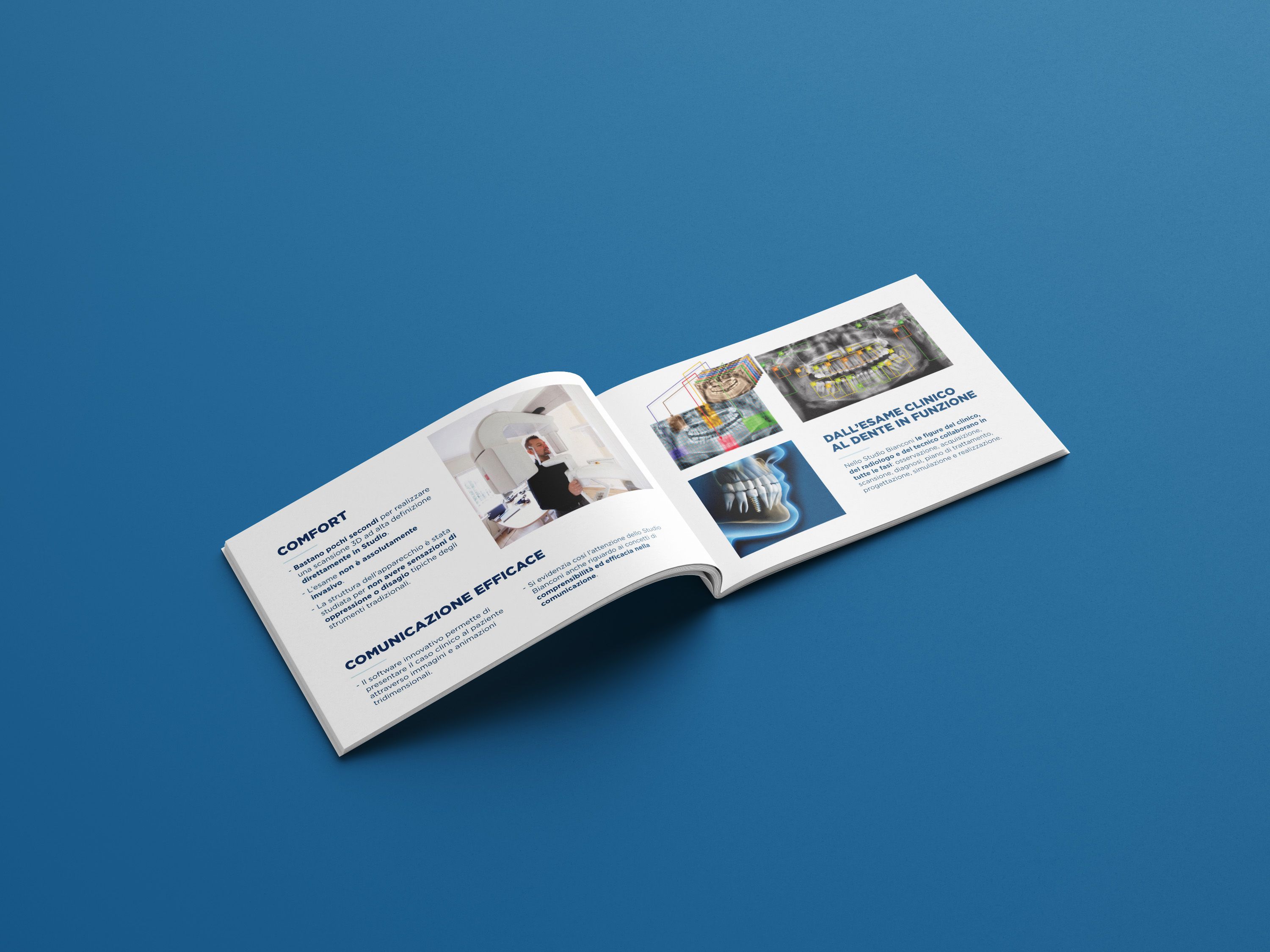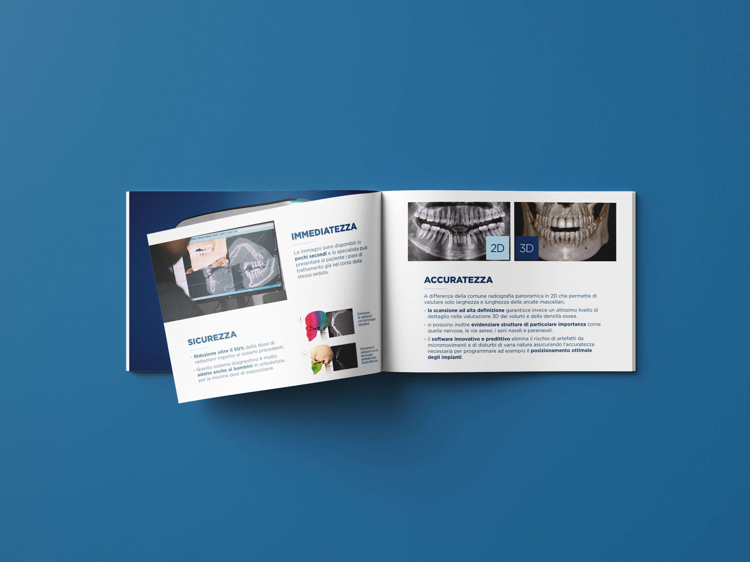 Le funzionalità e i vantaggi dell'uso di questa apparecchiatura sono spiegate in questa brochure in modo chiaro e semplice per essere comprensibile da tutti i pazienti dello studio. Questa brochure evidenzia la tradizionale ricerca di innovazione dello studio e l’attenzione riguardo ai concetti di comprensibilità ed efficacia nella comunicazione.
